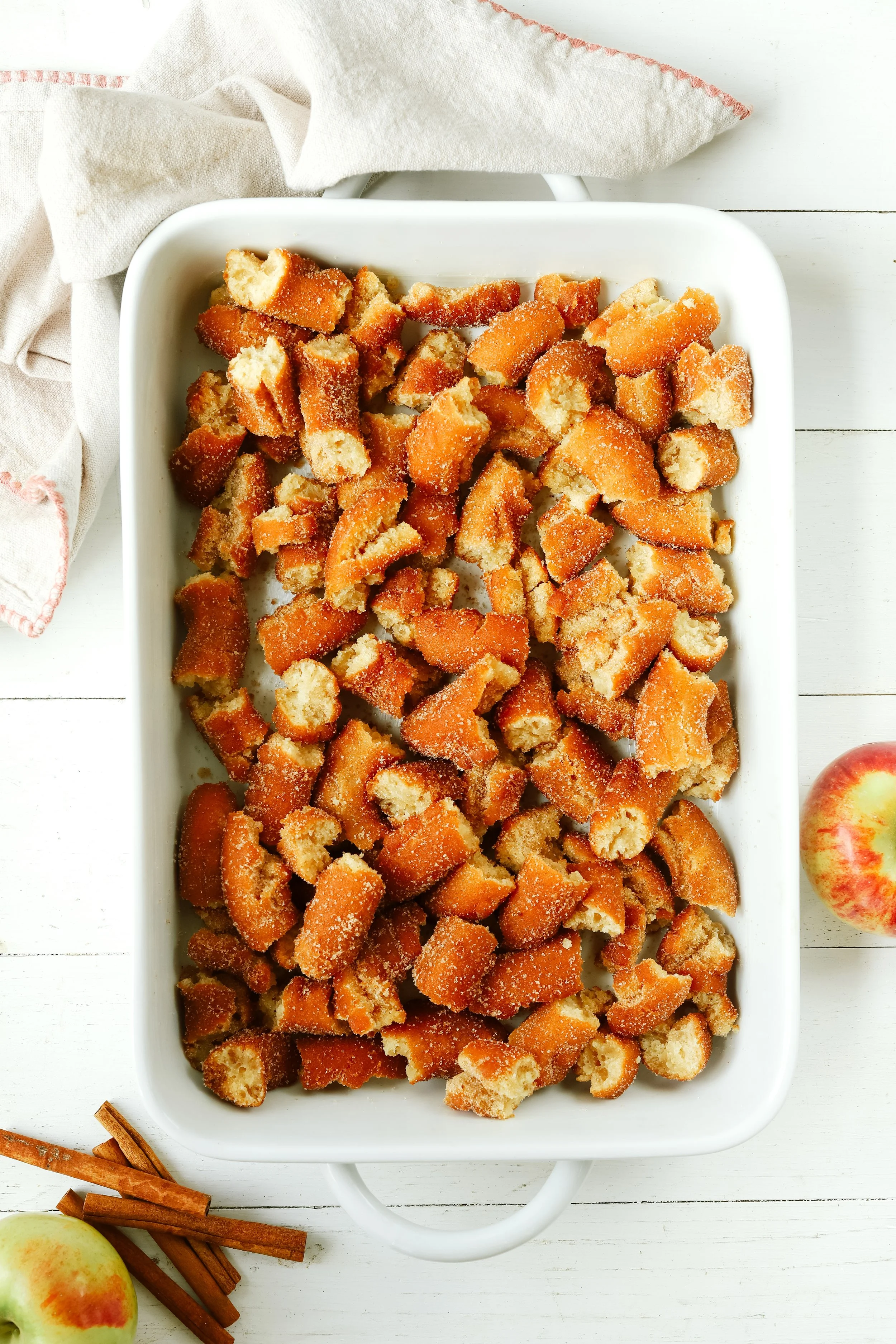 Break the stale doughnuts into bite-size pieces and place into the prepared dish.